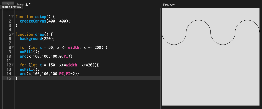 At first, I wanted to create some wavy lines with arches in different directions. I started with creating code to make pattern.