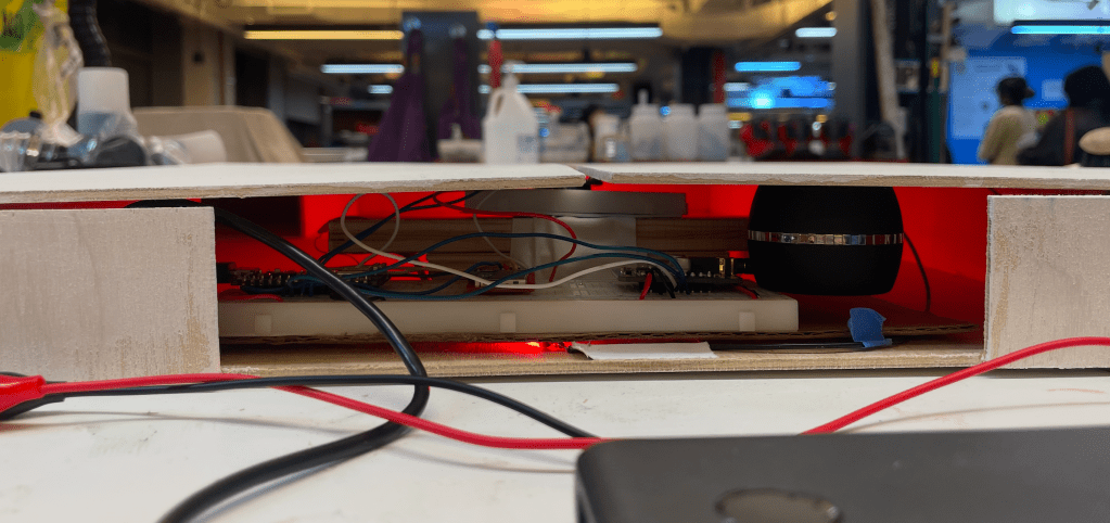 Before I glued the top, I fixed the red noods (flexible led) inside the box. When the light turns on, there will be a red light slightly coming through the gap in the middle.